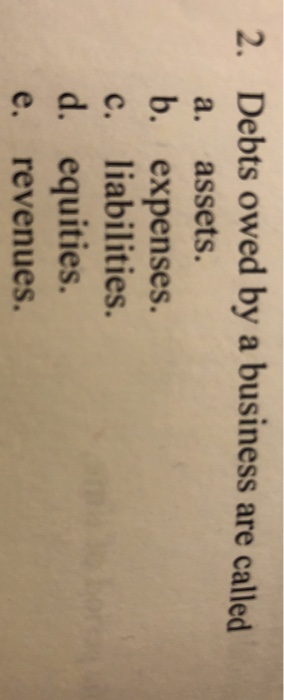 Debts owed by a business are referred to as. Assets revenues less liabilities d. Assets equities liabilities b. Assets revenues liabilities d.