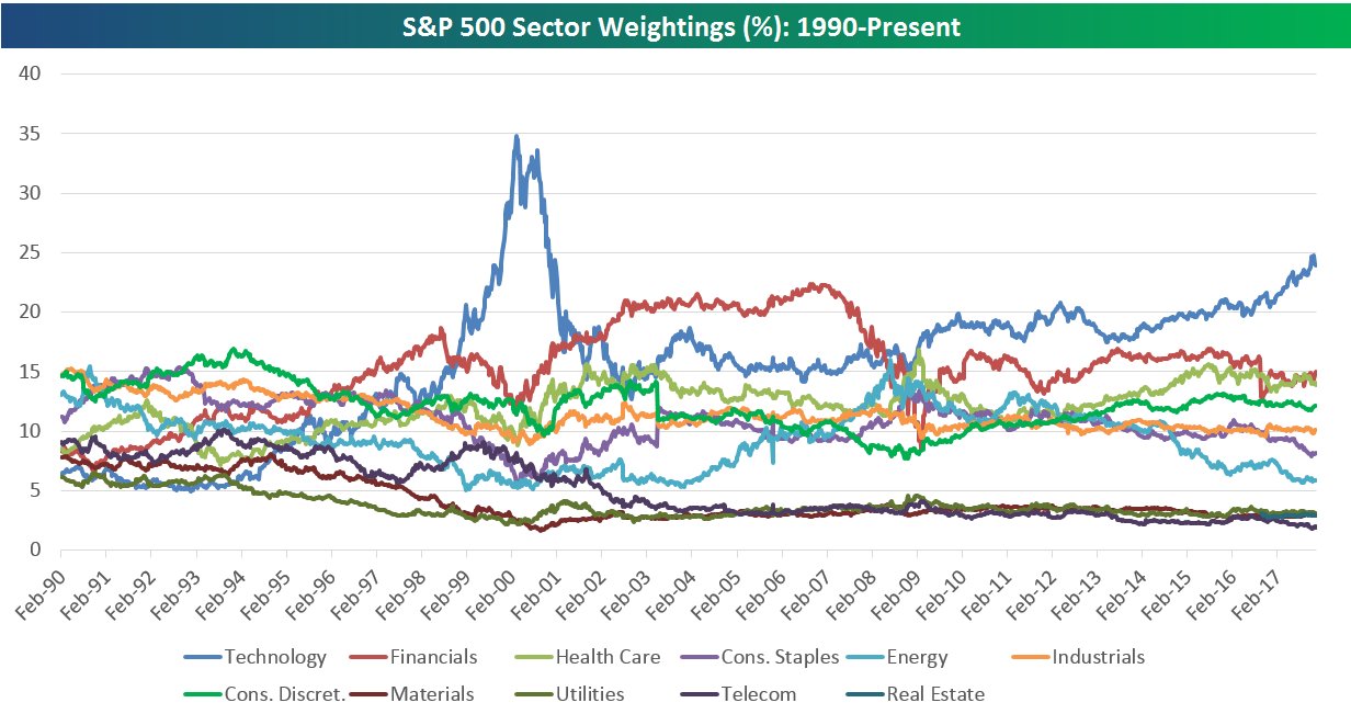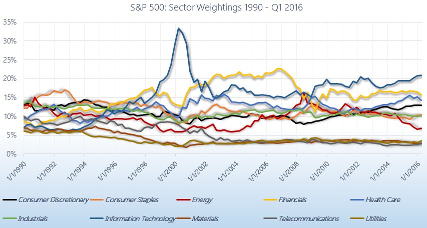 Telecommunications sector was replaced by the new communication services. Below is a chart and table highlighting the historical sector weightings of the s p 500 since 1990. In fact some investment strategies suggest a perfect balance of sectors because any sector can be the best performing group in any given year. Over the years when weightings have gotten extremely lopsided for one or two sectors it hasn t ended well.